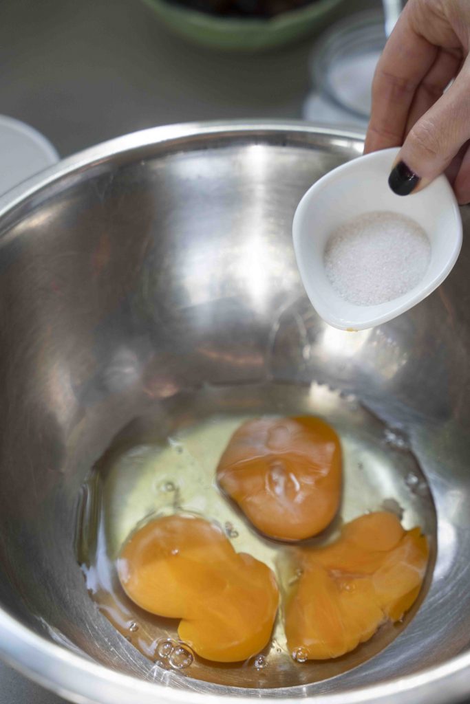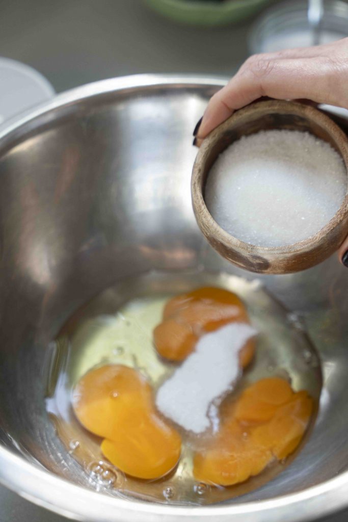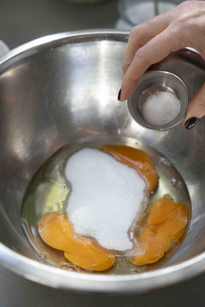 מכניסים לקערה בינונית-גדולה 3 ביצים, שקית סוכר וניל, 3 כפות סוכר, ו-½ כפית מלח וטורפים היטב עם מטרפה. לחילופין ניתן לטרוף בקערת המיקסר.
