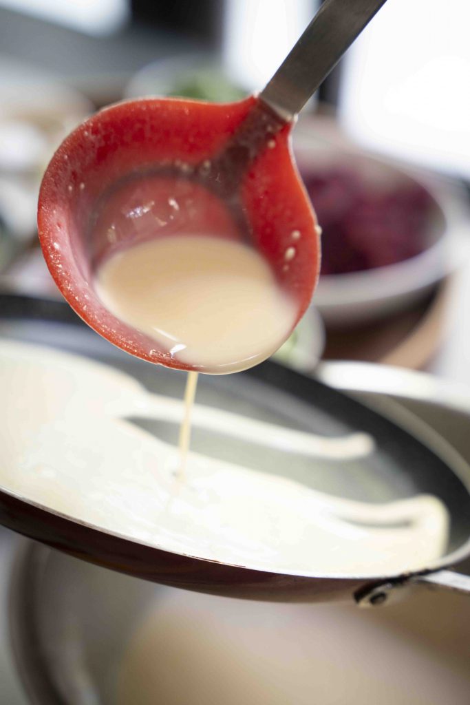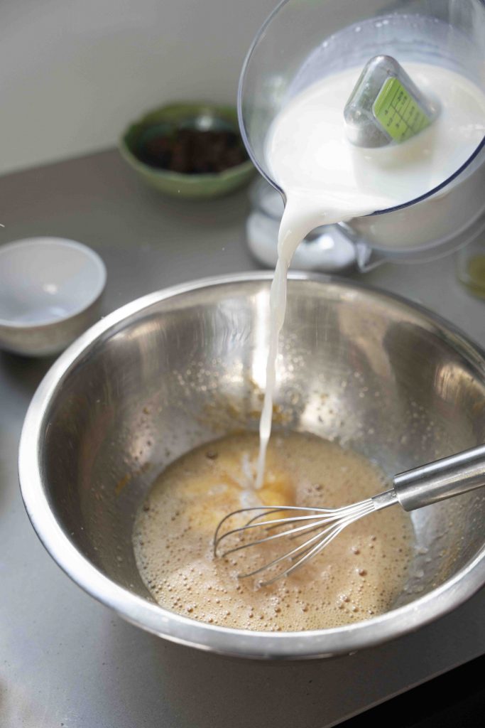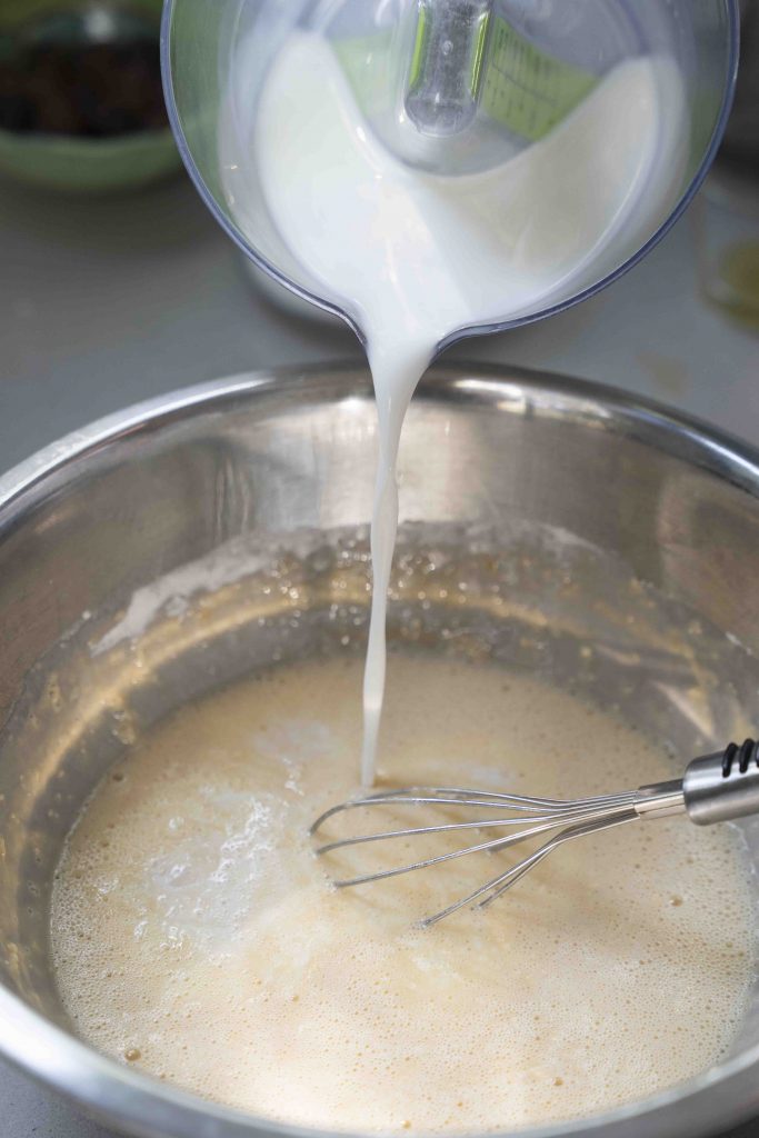 מוסיפים מחצית מכמות החלב וטורפים היטב.