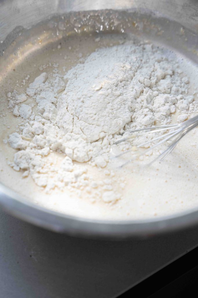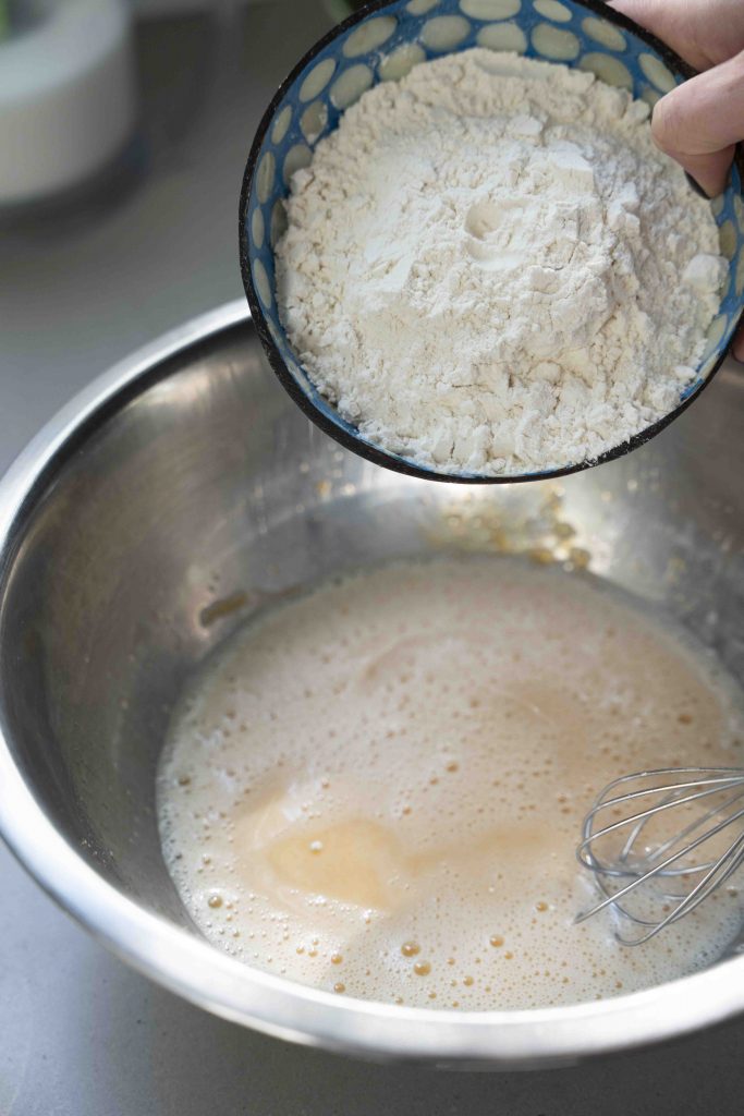 מוסיפים מחצית מכמות הקמח וטורפים היטב.