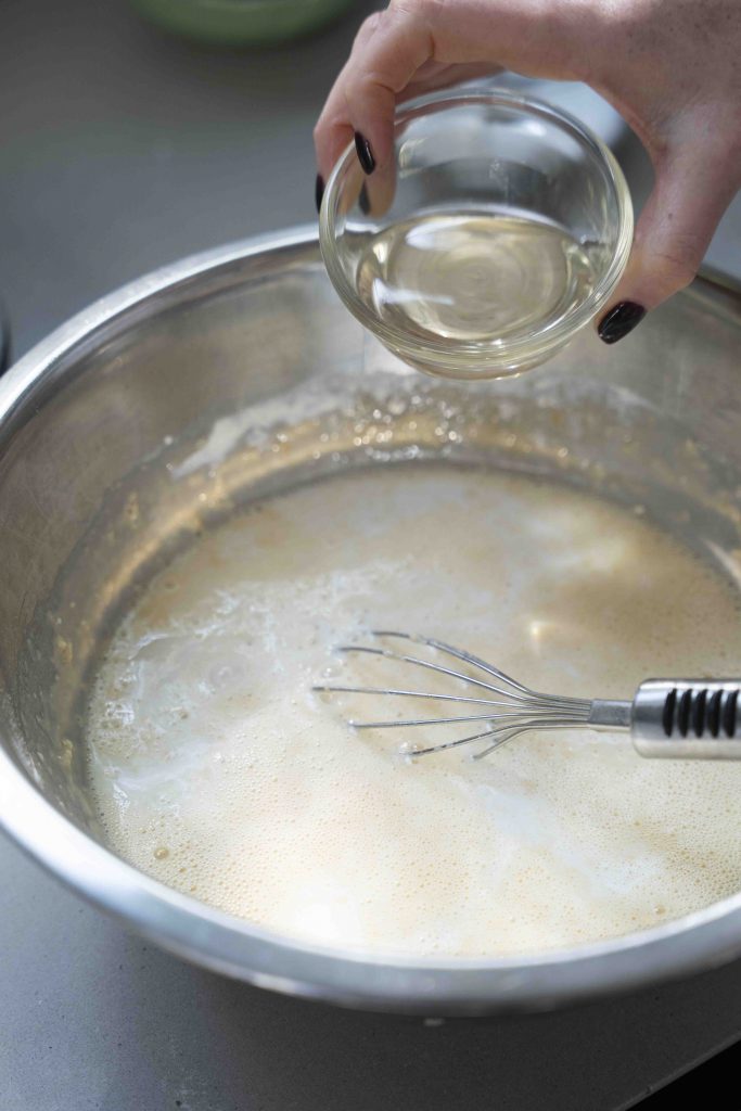 מוסיפים את יתרת החלב ו-3 כפות שמן החמניות וממשיכים לטרוף.