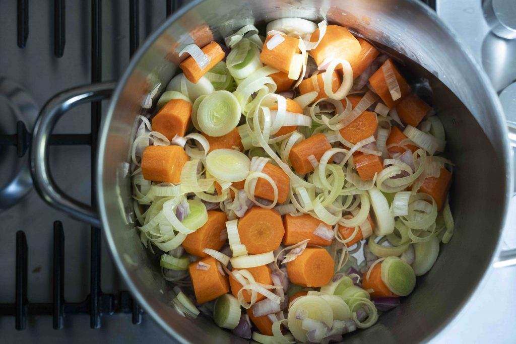 מחממים את שמן הזית בסיר גדול על להבה בינונית-גבוהה, מוסיפים את הבצל, הכרישה והגזר ומטגנים במשך מספר דקות ספורות עד שהבצל והכרישה נהיים מעט שקופים.