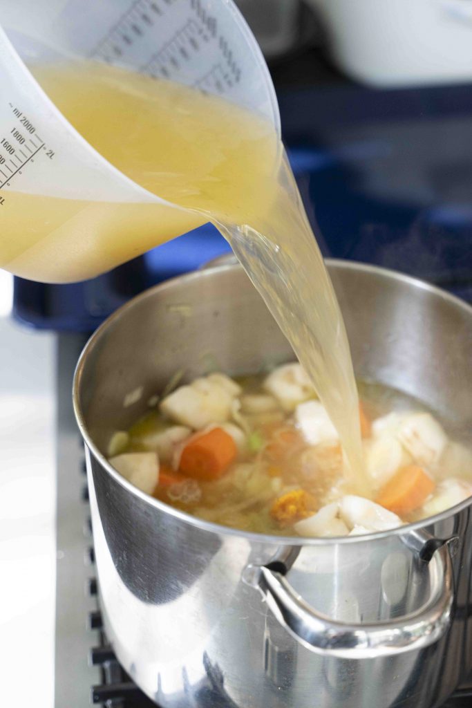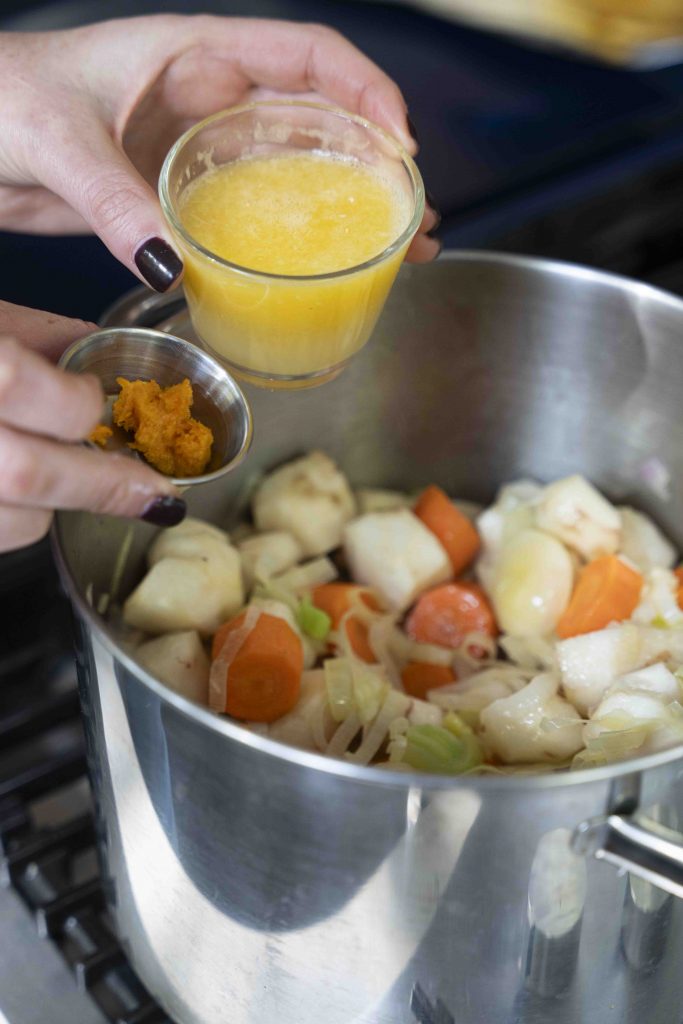 טוב, מספיק עם תופעות הלוואי, ניגש לעניין עצמו – שימו לב שרשמתי כי ניתן להוסיף ציר עוף או ציר ירקות. אני, כפי שכתבתי פעמים רבות, אוהבת להשתמש בשקיות ציר של אינה פאארמן. כמובן שאם בוחרים להשתמש בציר ירקות, מתקבל מרק צמחוני מצוין. כמו כן, יש במרק טוויסט חורפי מוצלח במיוחד בדמות מיץ מתפוז עסיסי שלם בתוספת כפית מגרידת אותו תפוז.