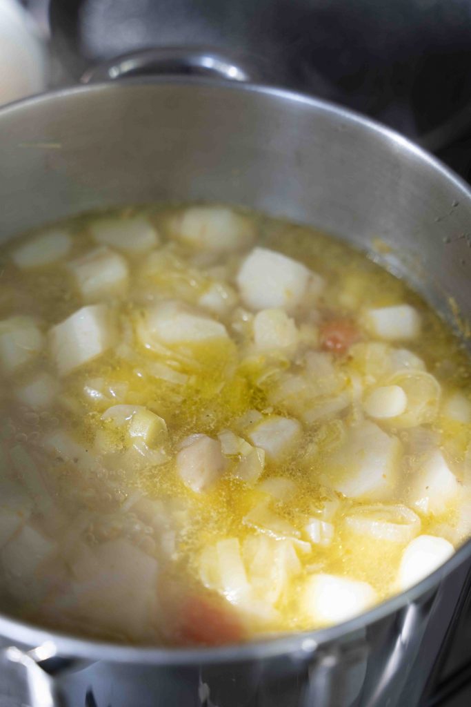 מוסיפים את טבעות הארטישוק הירושלמי, מערבבים ומזהיבים עוד מספר דקות.