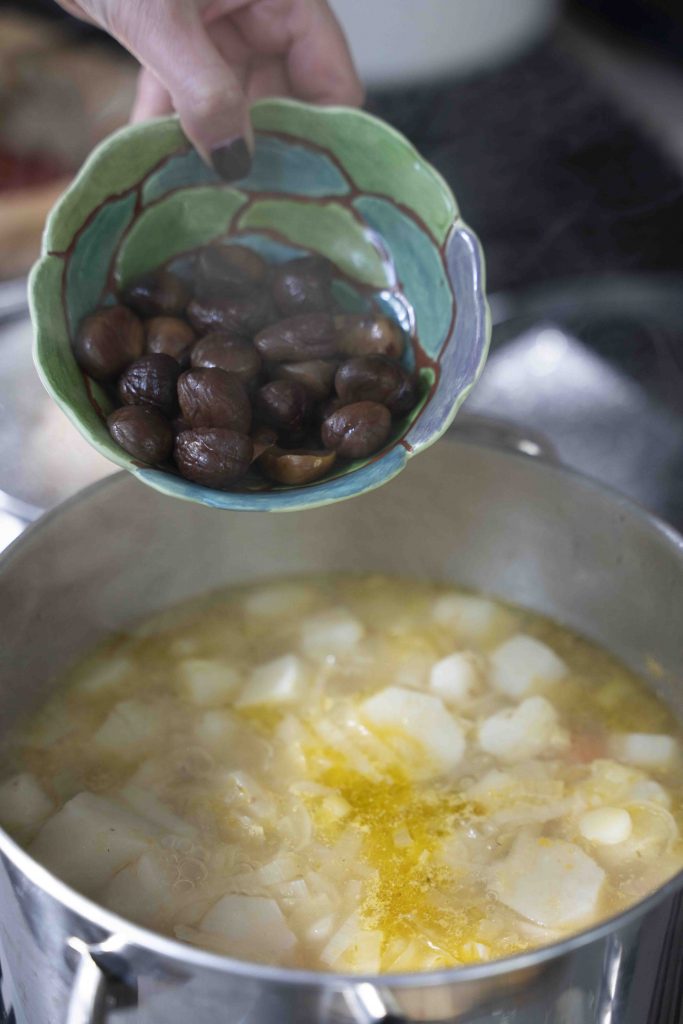 בנוסף, אני מציעה בגוף המתכון כמה תוספות שלי על המתכון המקורי שהעביר לי אודי'לה (אותו אחד שהביא לנו כבר את הלחמניות ממולאות בשר, מרק התירס האסייתי, הפאני פורי ועוד): כפי שציינתי פעמים רבות בעבר, אני מאוהבת בערמונים, בעיקר בחורף, אז ממש התבקש מבחינתי לשלב ערמונים עם הארטישוק הירושלמי – ככה שלקראת סיום בישול המרק אני ממליצה להוסיף שקית ערמונים (אפשר גם שתיים אם אתם ממש מתעקשים ) ולטחון הכל יחד. מניסיון אגיד לכם שיוצא מדהים. תוספת נוספת שלי היא כפית פתיתי הצ'ילי שהוספתי בשלב התיבול אחרי טחינת המרק. בעיניי, הצ'ילי ממש מקפיץ את המרק. אם אתם מעוניינים בפיקנטיות יותר מעודנת, הוסיפו רק ½ כפית פתיתי צ'ילי. אם יש לכם פלפל קאיין – גם אלטרנטיבה נהדרת לצ'ילי.