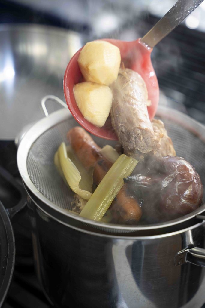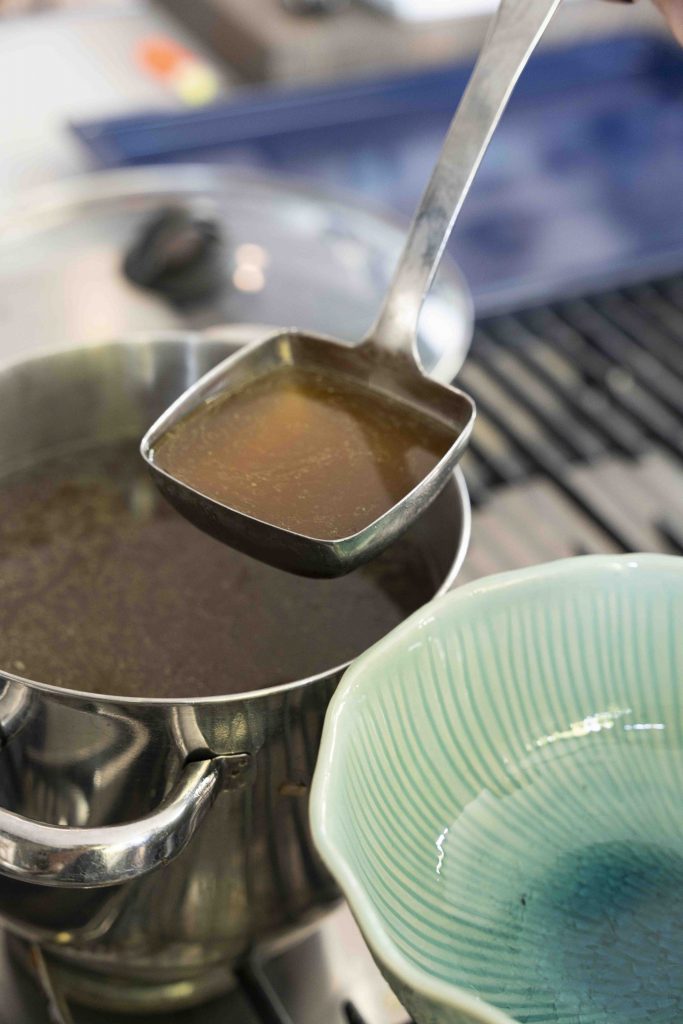מסננים את המרק ומחזירים את הנוזל בלבד לסיר (או שמסננים את המרק מעל מסננת ישירות לסיר אחר, כפי שמצולם).