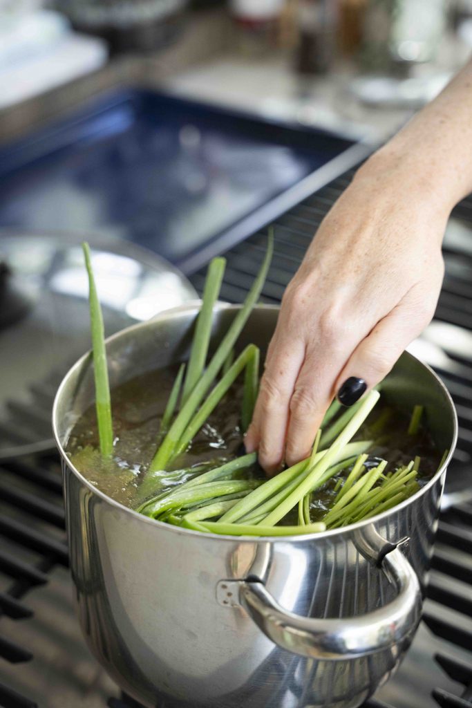 מוסיפים את צרור הכוסברה והחלקים הירוקים של הבצל הירוק ומבשלים 10 דקות נוספות. מסננים שוב.