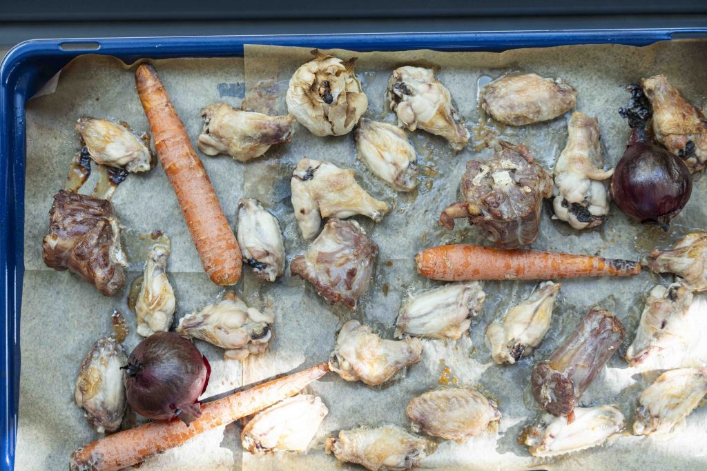 מרפדים תבנית תנור בנייר אפייה ומניחים בה בשכבה אחת את הכנפיים (וגם את הגרון, אם משתמשים), 2 הבצלים האדומים השלמים והלא מקולפים, ראש השום השלם ו-3 הגזרים השלמים והלא מקולפים.