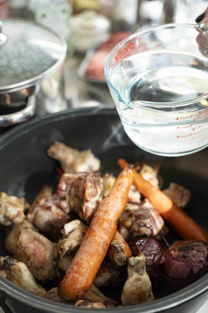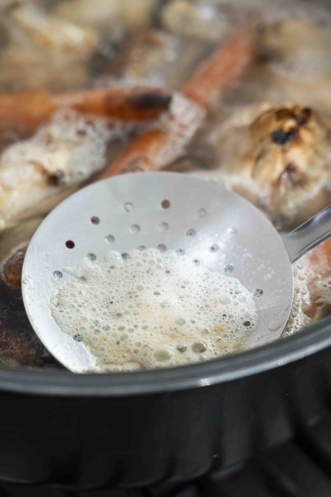 מעבירים את תכולת התבנית לסיר גדול מאד ומוסיפים כ-4.5 ליטר מים (כ-18 כוסות), מרתיחים על להבה בינונית-גבוהה ומסירים את הקצף שנוצר על פני המרק בעזרת כף.
