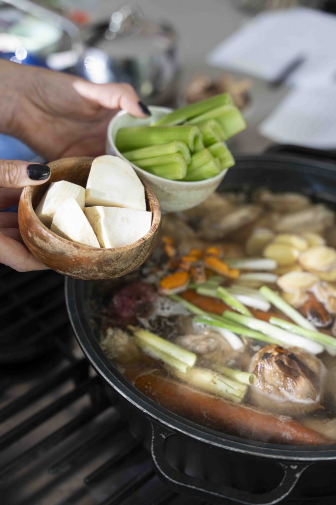 כעת, מוסיפים את החלקים הלבנים של צרור הבצל הירוק, את הג'ינג'ר הפרוס, הכורכום הפרוס, שורש ומקלות הסלרי, פטריות השיטאקי, מקל הלמון גראס, עלי הכפיר ליים ואצת הקומבו – אם משתמשים בה.