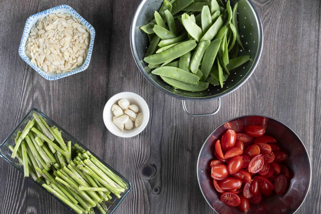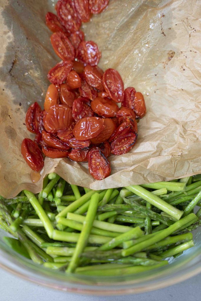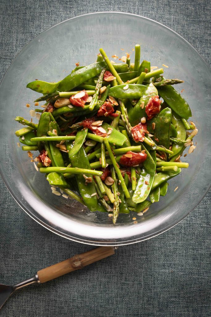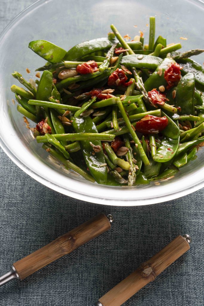 סלט אפונת שלג, אספרגוס ועגבניות שרי צלויות