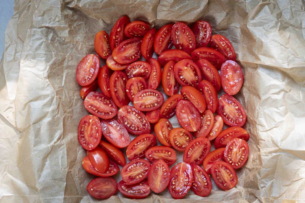 מרפדים תבנית קטנה המתאימה לתנור בנייר אפייה ומניחים עליה בשכבה אחידה את חצאי עגבניות השרי עם חלקן החתוך כלפי מעלה.