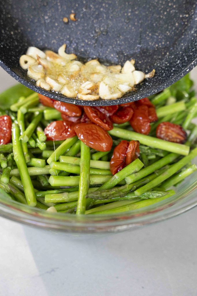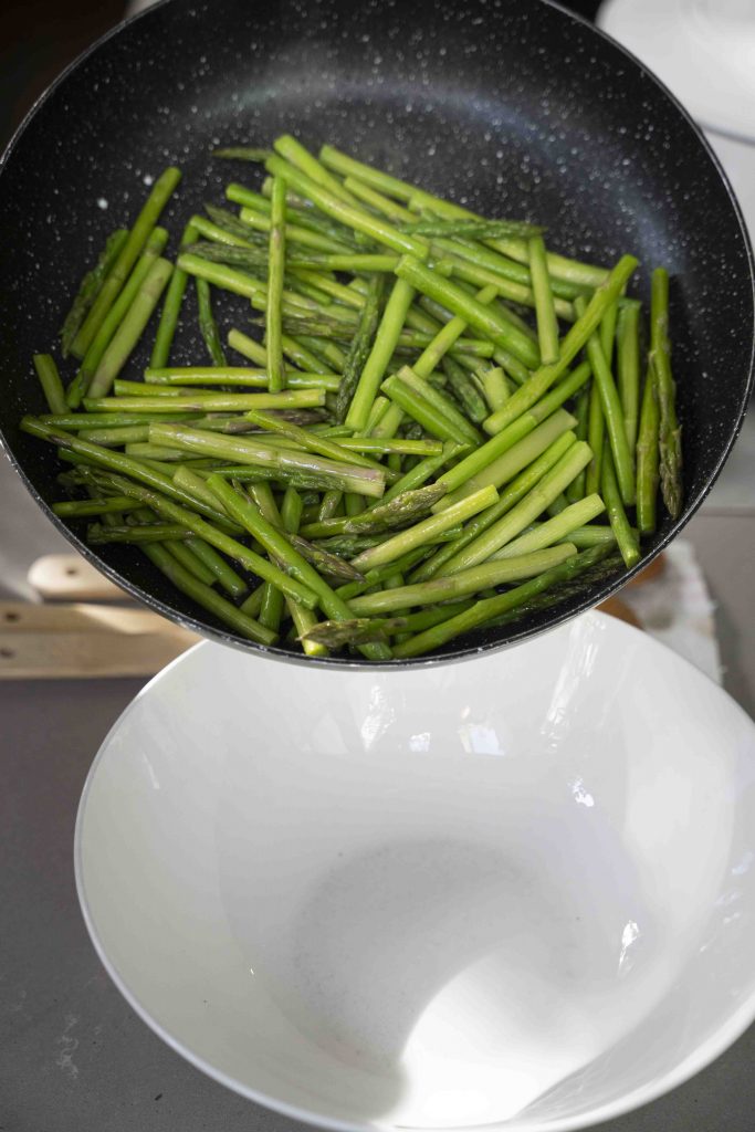 מחממים 2 כפות שמן זית במחבת גדולה ומקפיצים בה במשך כ-4 דקות את חתיכות האספרגוס עד שמעט מתרככות, ומעבירים לקערה בינונית-גדולה.