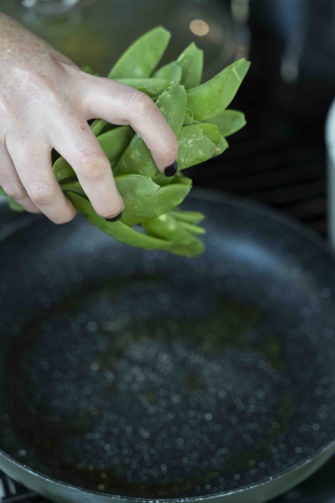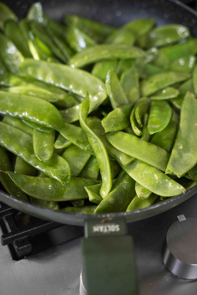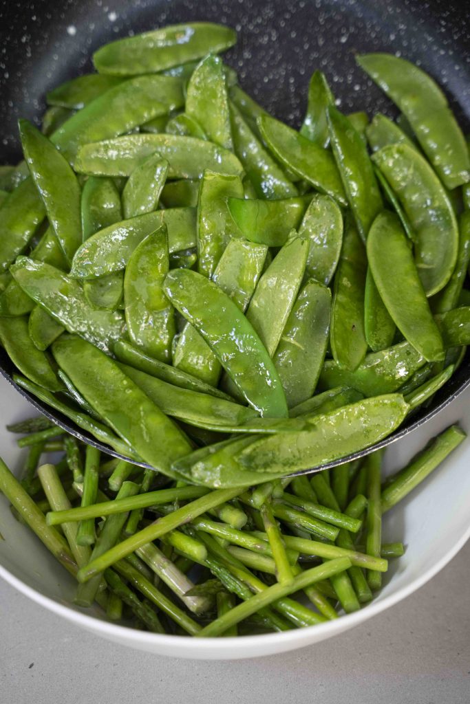 לאותה מחבת מוסיפים עוד כף שמן זית ומכניסים את אפונת השלג. מקפיצים גם אותה למשך כ-2 דקות ומצרפים אותה לקערה עם האספרגוס.