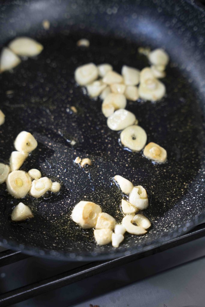 לבסוף, מוסיפים למחבת עוד כף שמן זית ומטגנים את שיני השום הפרוסות תוך כדי ערבוב מדי פעם למשך כ-2 דקות, ומוסיפים גם אותן (יחד עם השמן) לקערה.