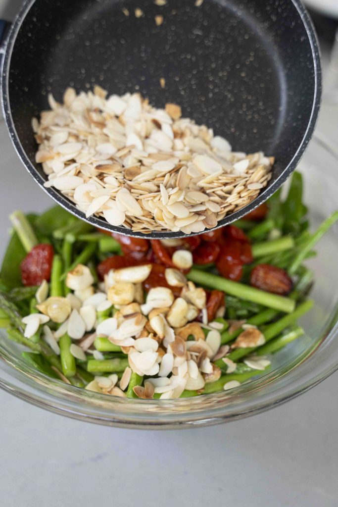 מוסיפים את פרוסות השקדים הקלויות לקערה, מתבלים במלח ים ופלפל שחור טחון טרי בנדיבות, מערבבים בעדינות ומגישים.