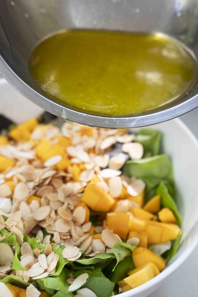 מכניסים לקערה את עלי החסה סלנובה הקרועים גס, את קוביות האפרסמון ואת השקדים הפרוסים הקלויים.