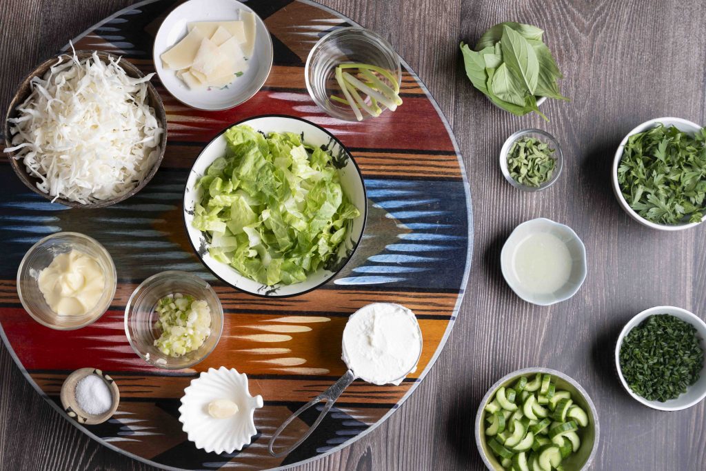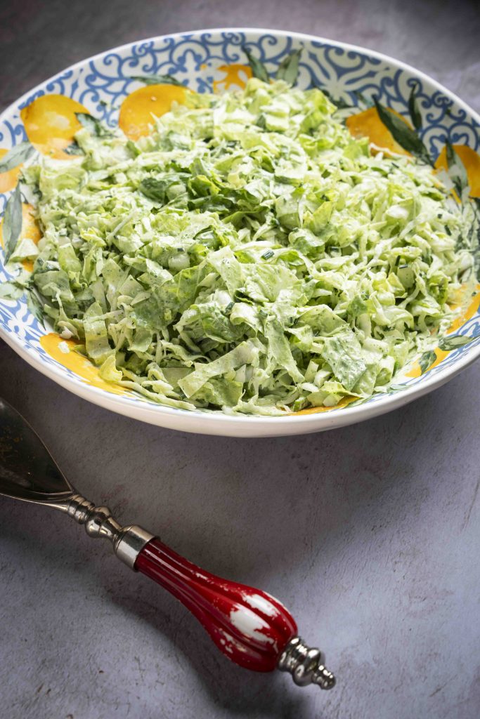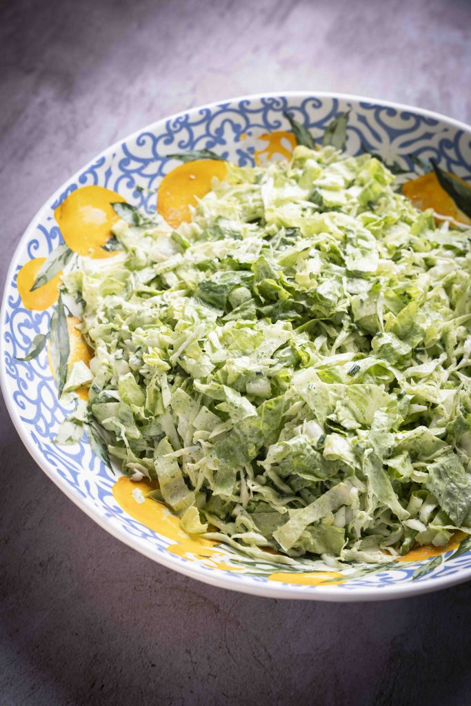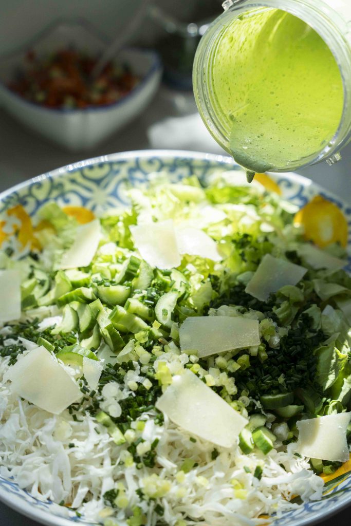 אגיד שבגרסאות שונות של רוטב green goddess יש גם אנשובי, עליו ויתרתי. החלטתי להשאיר את הסלט צמחוני, מבלי להתפשר לרגע על הטעם. ברוטב שלנו תמצאו יוגורט יווני משובח, מעט מיונז (ממליצה על יפני) ועשבי תיבול – שיכולים להשתנות כל פעם בהתאם למה שזמין וטעים לכם – בכל מקרה אני ממליצה שלא לוותר על הבזיליקום והפטרוזיליה. על אלה אפשר להוסיף כוסברה, אורגנו, שמיר.. מה שאוהבים. דרך אגב, ניתן להכין את הרוטב מראש שיחכה לסלט במקרר.