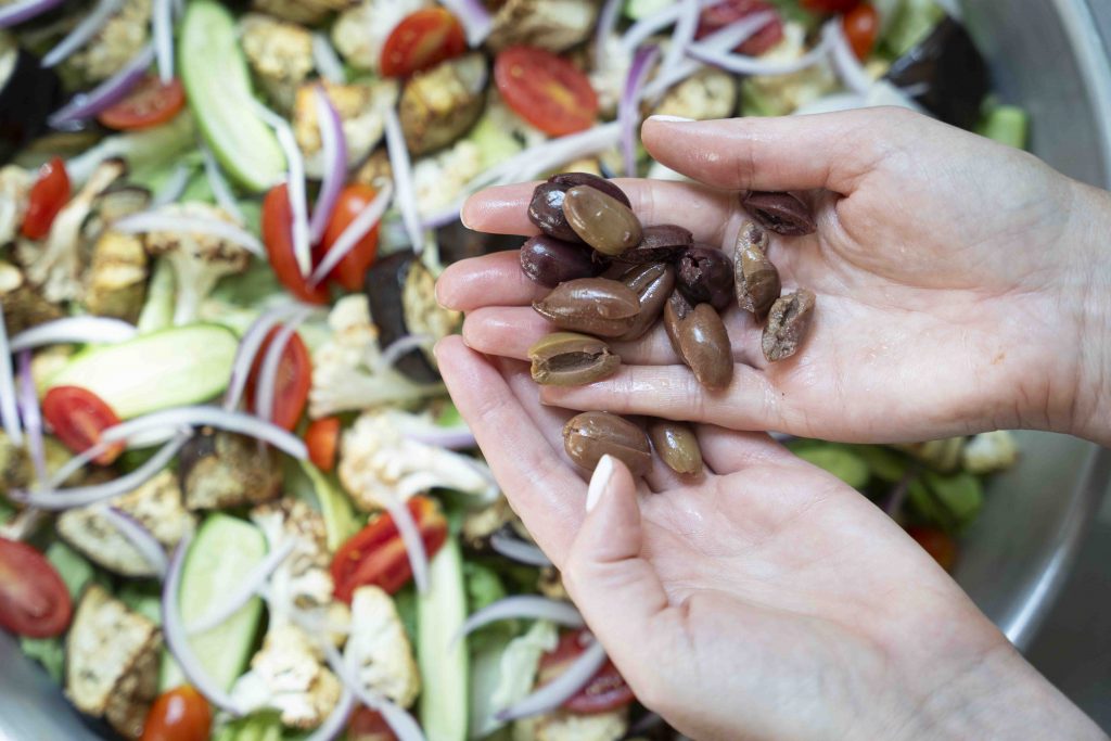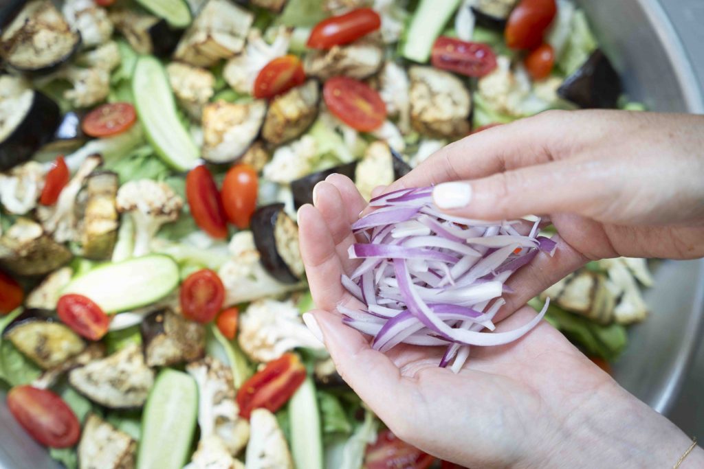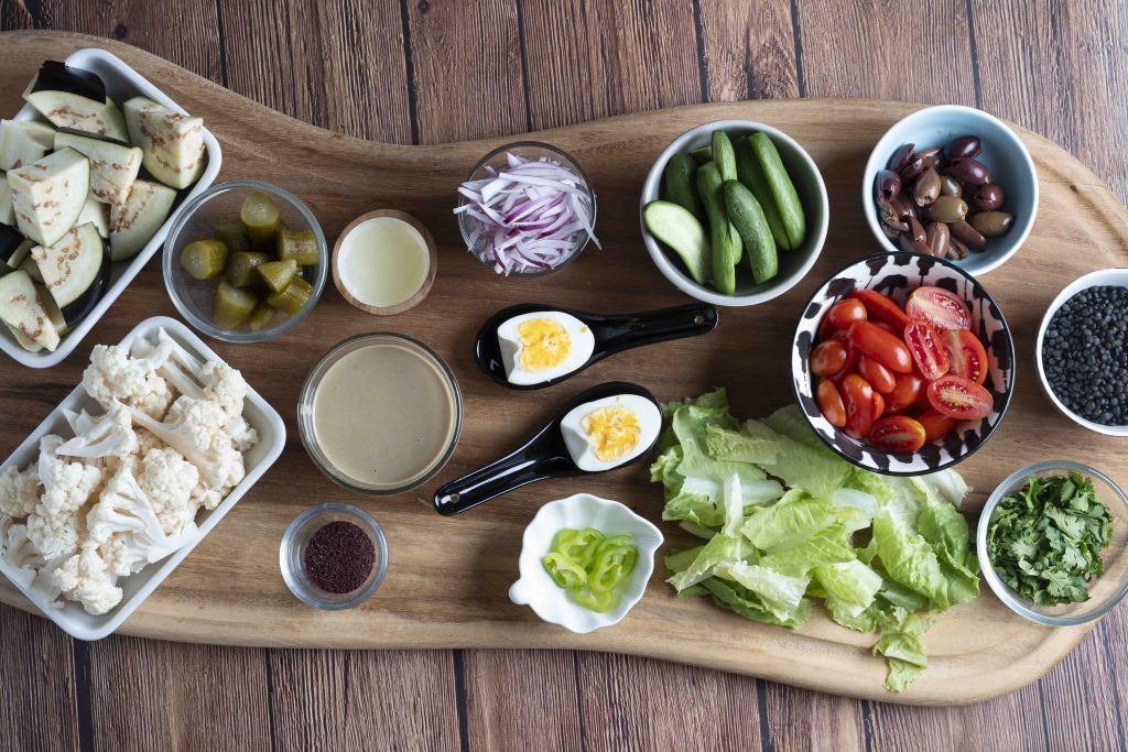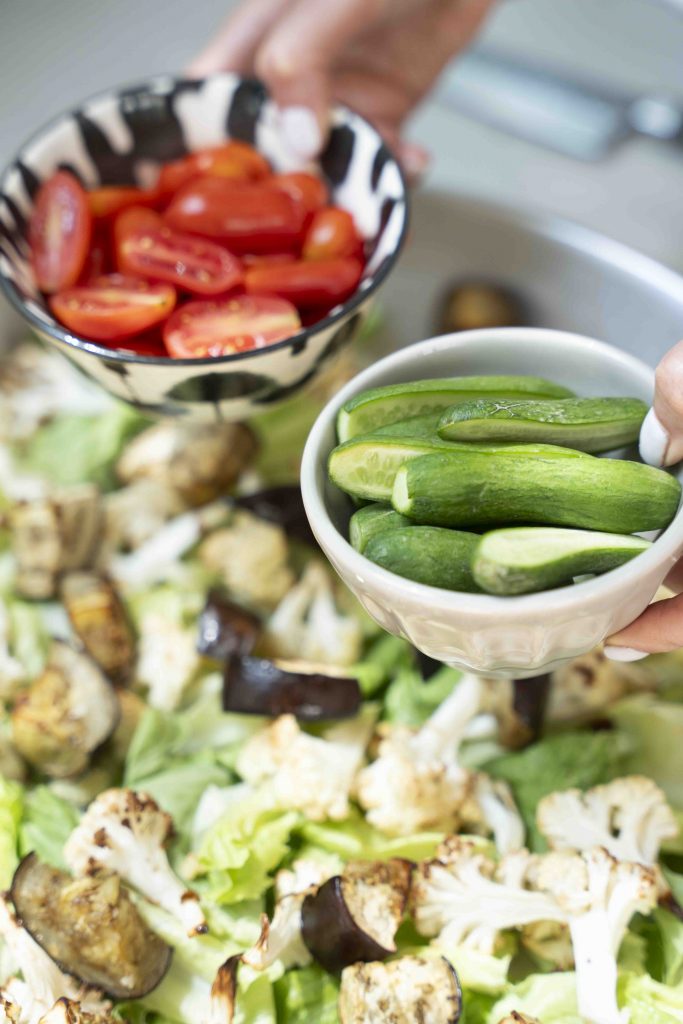 מפזרים מעליה את הכרובית והחציל הצלויים, המלפפונים, עגבניות השרי, הבצל הסגול, זיתי הקלמטה, העדשים השחורות (אם משתמשים), הפלפל החריף (אם משתמשים) והמלפפון החמוץ (אם משתמשים).