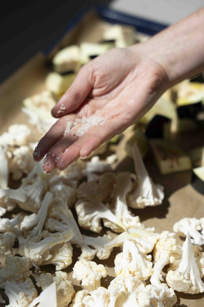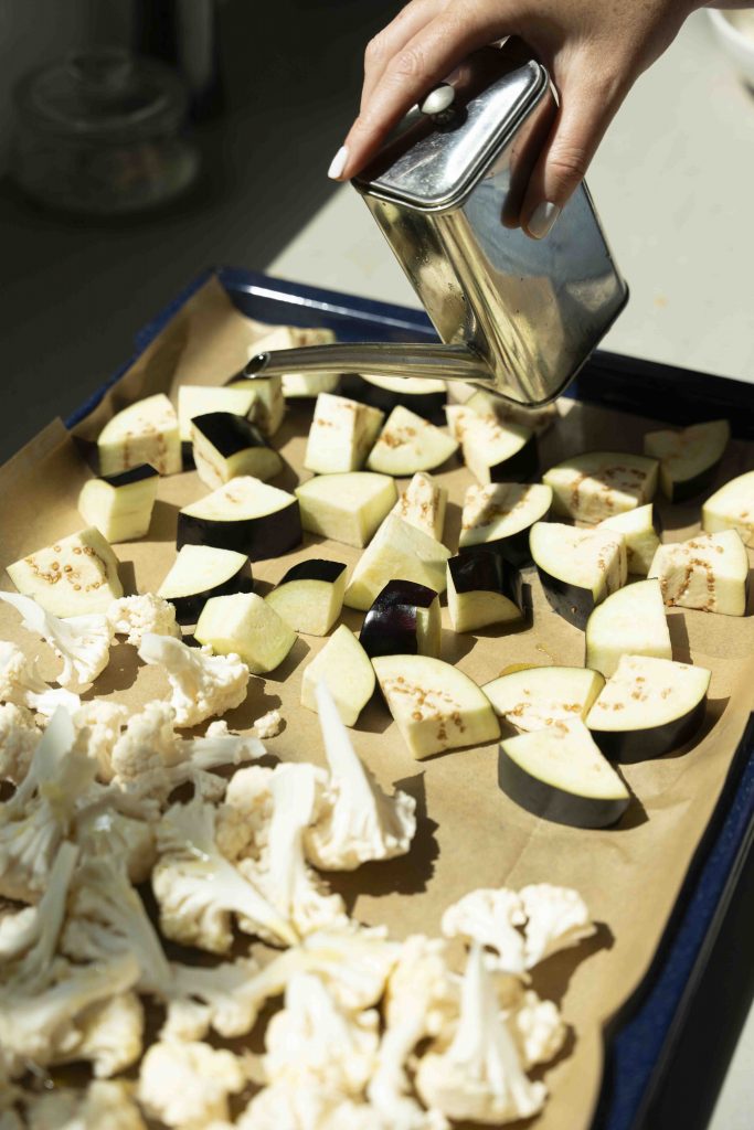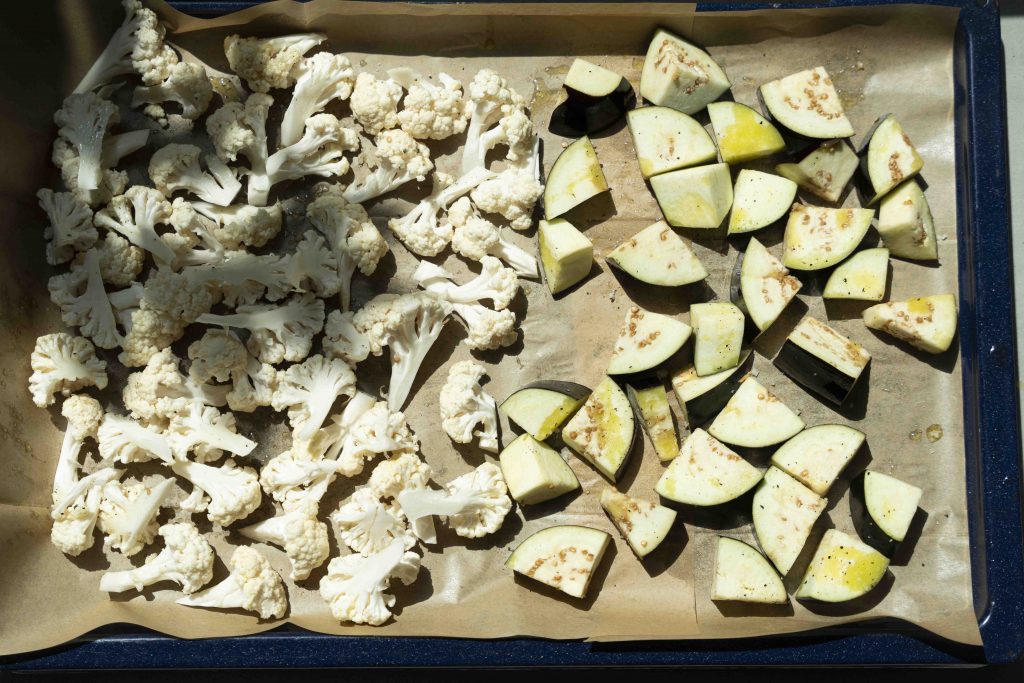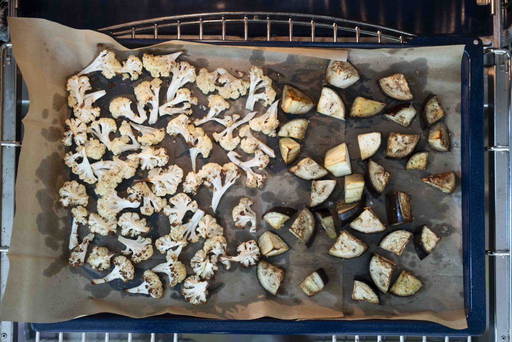 מניחים את הכרובית והחציל על תבנית תנור מרופדת נייר אפייה, זה לצד זה, ומתבלים אותם בכ-2 כפות שמן זית, מלח ים ופלפל שחור טחון טרי. מערבבים עם הידיים ומכניסים לתנור לכ-30 דקות עד שצלויים ומעט שחומים. מניחים בצד.