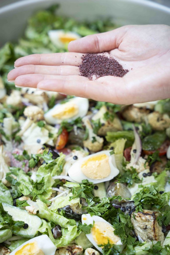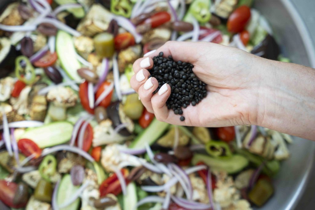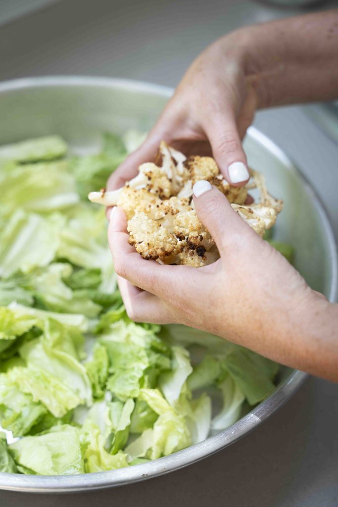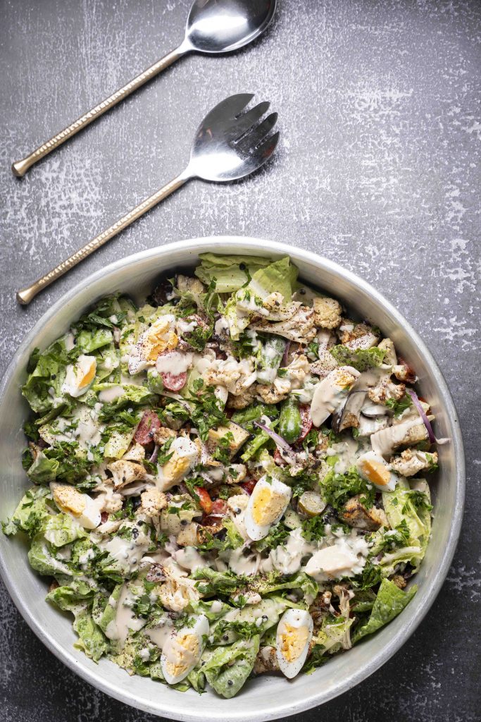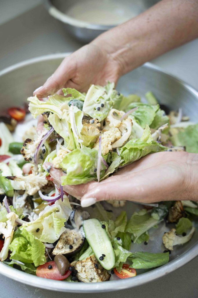 במקרה של הסלט של ריקי – ממש הופכים את הסביח לסלט, עם בסיס של חסה פריכה, כאשר אליה מוסיפים את המרכיבים המוכרים של הסביח וגם כמה אורחים נוספים ונפלאים, כמו כרובית צלויה ואפילו עדשים שחורות (בוסט נוסף של חלבון שמתקבל באהבה גדולה). בעצם, את תפוח האדמה המסורתי של הסביח ריקי המירה בעדשים שחורות, אך כמובן שמי שרוצה מוזמן להוסיף לסלט גם קוביות של תפוח אדמה מבושל.