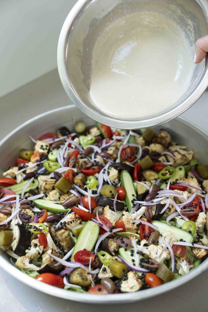 ממש לפני ההגשה מוזגים מחצית מהטחינה הנוזלית מעל הסלט ומערבבים היטב.