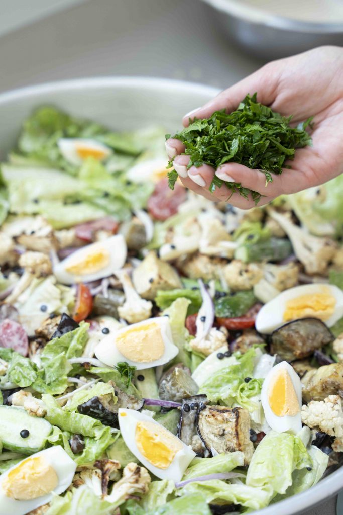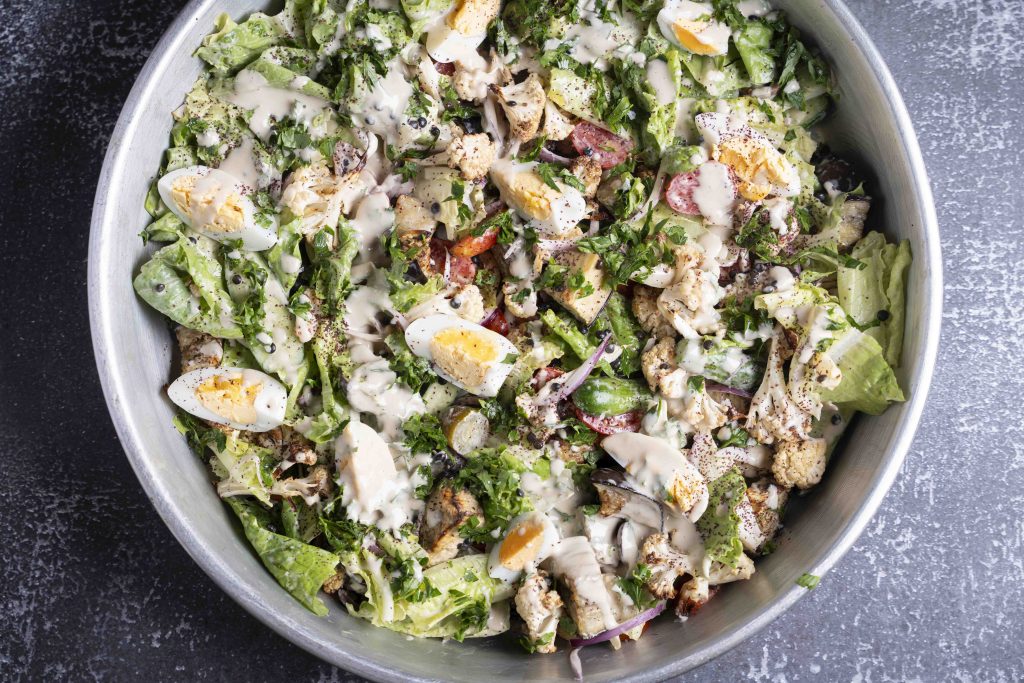 צריך להבין שהטחינה הנוזלית היא בעיקר הרוטב – חלק נערבב עם מרכיבי הסלט וחלק נשאיר בשביל לזלף מעל.