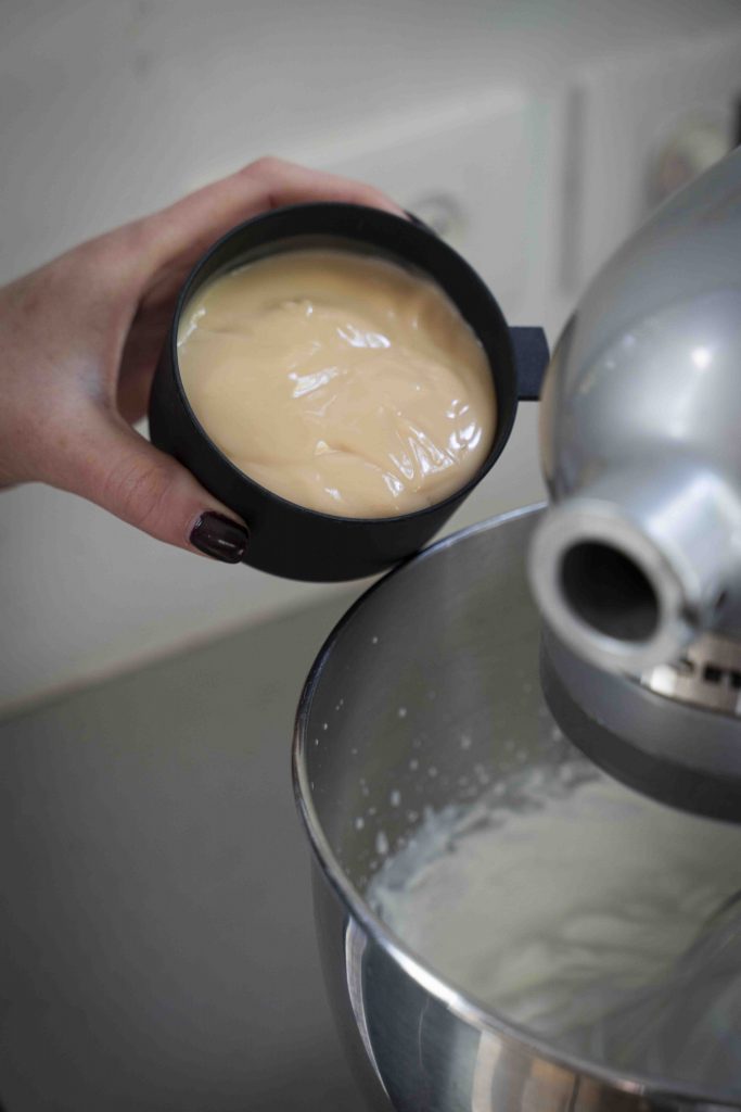 מערבבים פנימה, במהירות איטית, את החלב המרוכז, רק עד שנטמע בקצפת.
