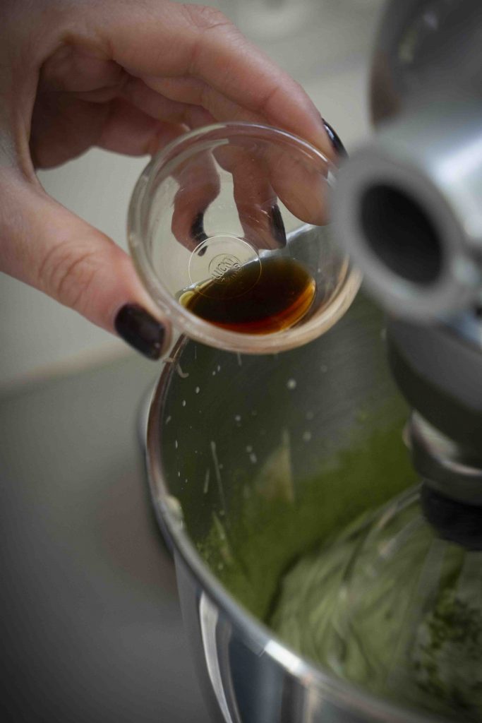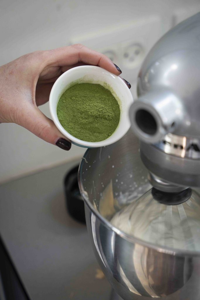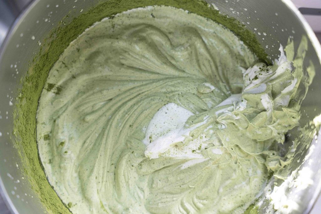 מוסיפים את אבקת המאצ'ה לאט ובכמה פעימות וכפית תמצית הוניל וממשיכים לערבל במהירות איטית רק עד לצביעת התערובת. לסיום, מקפלים עם לקקן בעדינות כדי לוודא שהתערובת אחידה וללא כיסים לבנים.