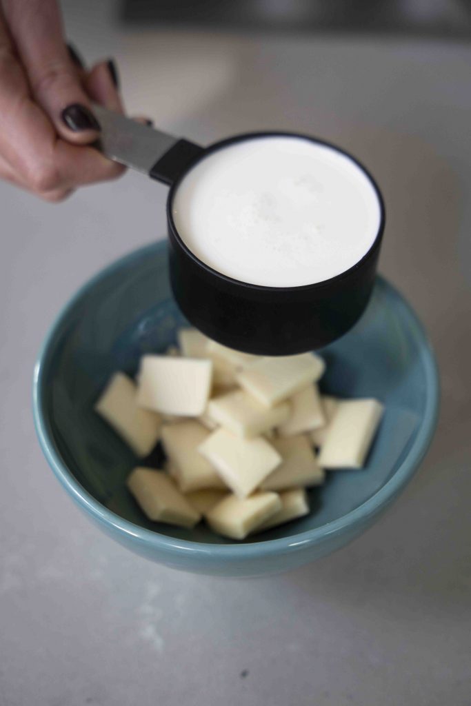 על הכיריים: מחממים את השמנת המתוקה בסיר קטן עד לסף רתיחה. מכבים את האש ומכניסים פנימה את קוביות השוקולד הלבן. מחכים כמה שניות ומערבבים עד לקבלת תערובת אחידה וחלקה.
