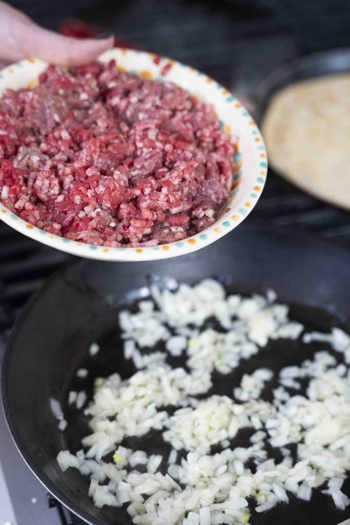 מוסיפים את הבשר הטחון, מערבבים מדי פעם ומפוררים עם כף עץ או מזלג, עד שמשנה את צבעו ואפילו מעט משחים ועד שנהיה מפורר לחלוטין, במשך כ-15-20 דקות.