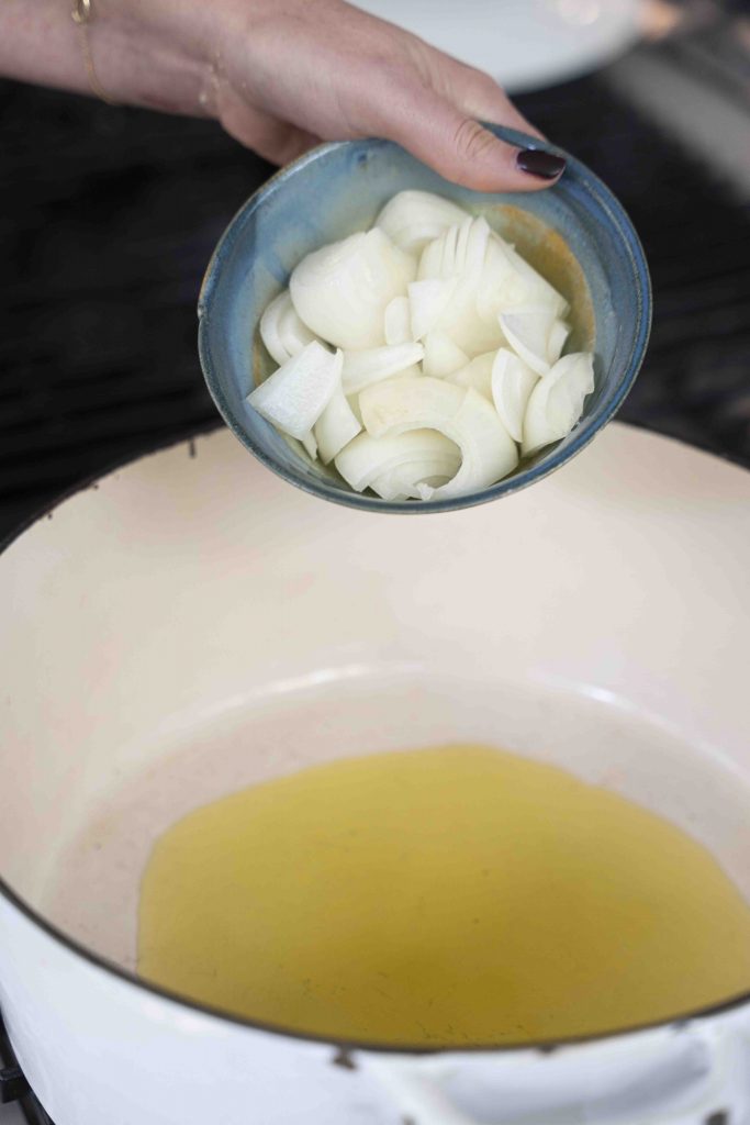 מחממים בסיר גדול 4 כפות שמן זית על להבה בינונית-גבוהה, מוסיפים את הבצל הגדול הקצוץ גס ומטגנים למשך כ-2 דקות, תוך ערבוב מדי פעם, עד שהבצל מעט מתרכך ונעטף כולו בשמן.