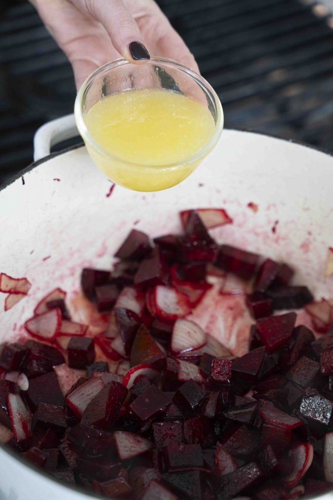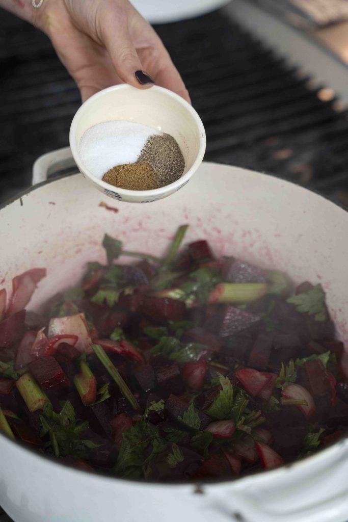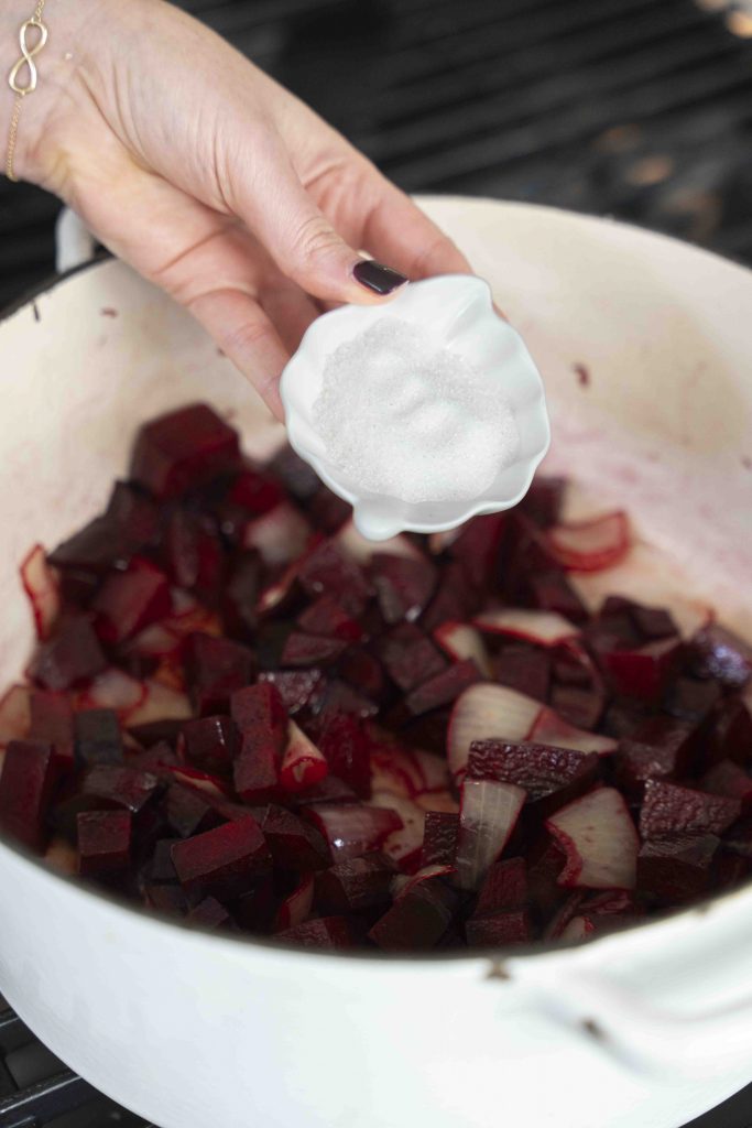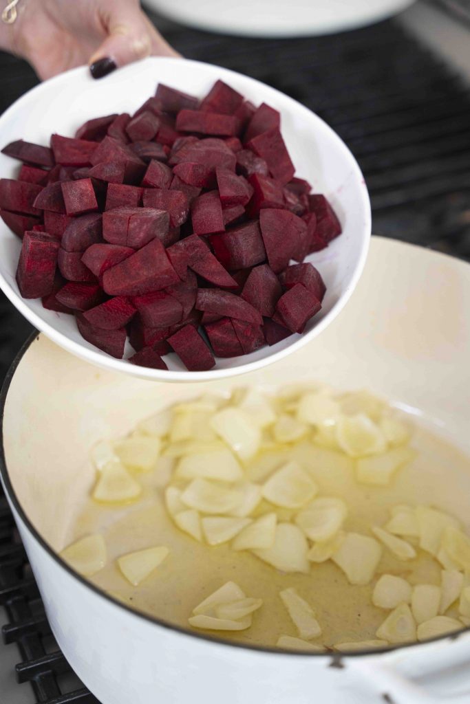 מוסיפים את קוביות הסלקים ומערבבים למשך כ-2 דקות נוספות עד שגם הבצל נצבע באדום.
