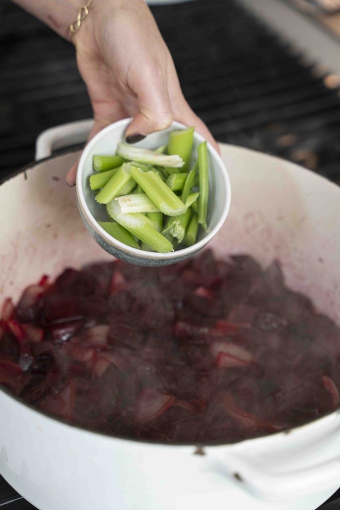 מוסיפים את 2 גבעולי הסלרי הקצוצים גס ומערבבים.