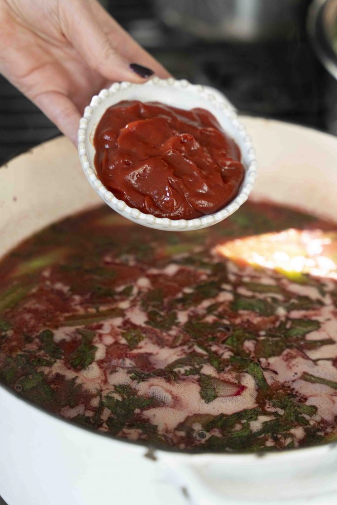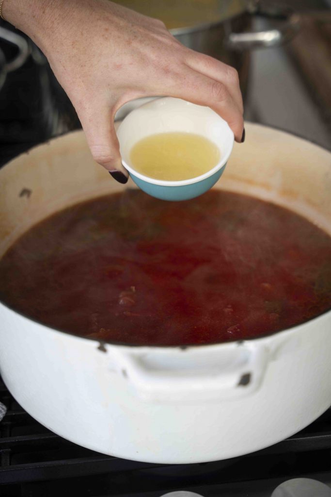 מוסיפים את רסק העגבניות, מערבבים, מכסים ומנמיכים ללהבה בינונית-נמוכה למשך שעה.