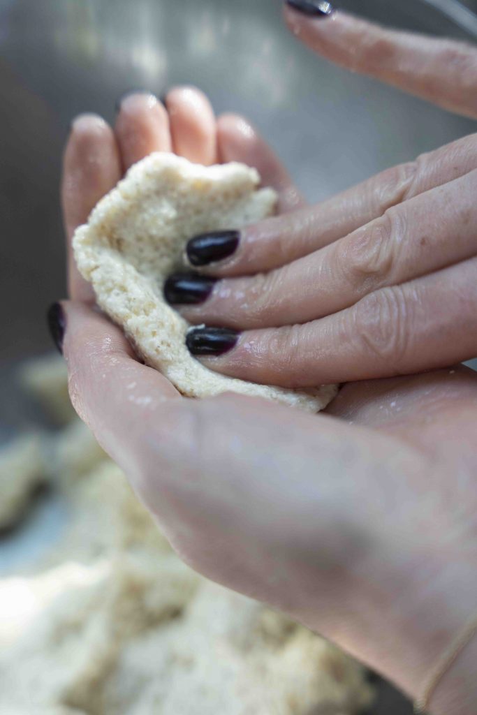 לפני שמתחילים מערבבים מעט את תערובת הסולת, מרטיבים את הידיים בקערת המים ולוקחים מקערת הסולת מעט מהתערובת ומגלגלים לכדור קטן מכדור פינג פונג.