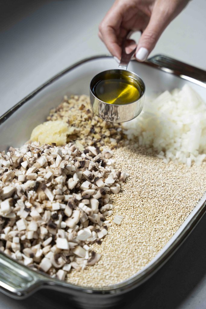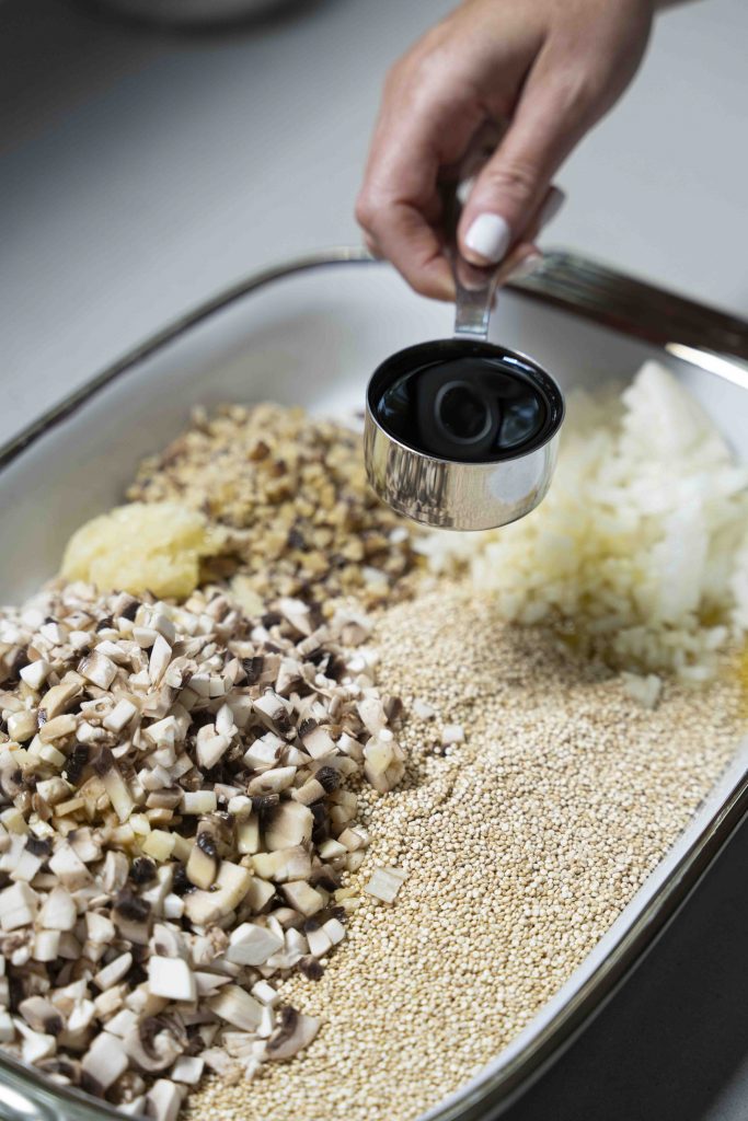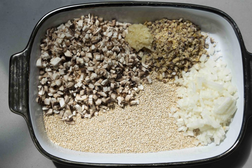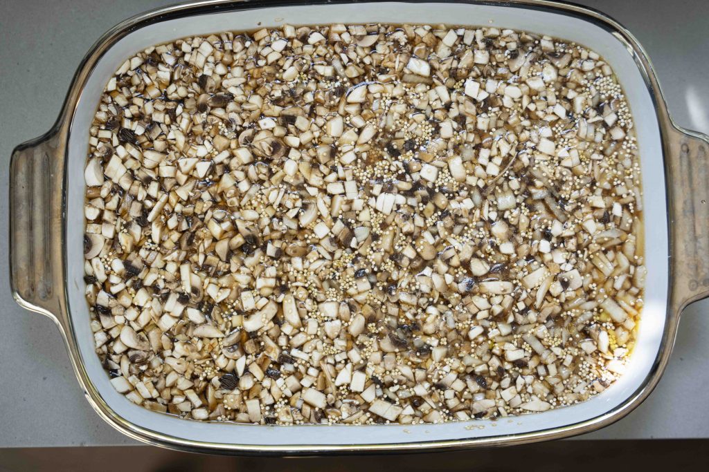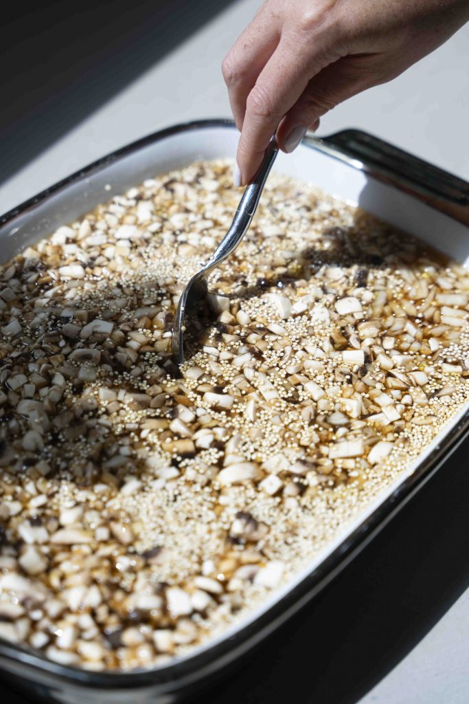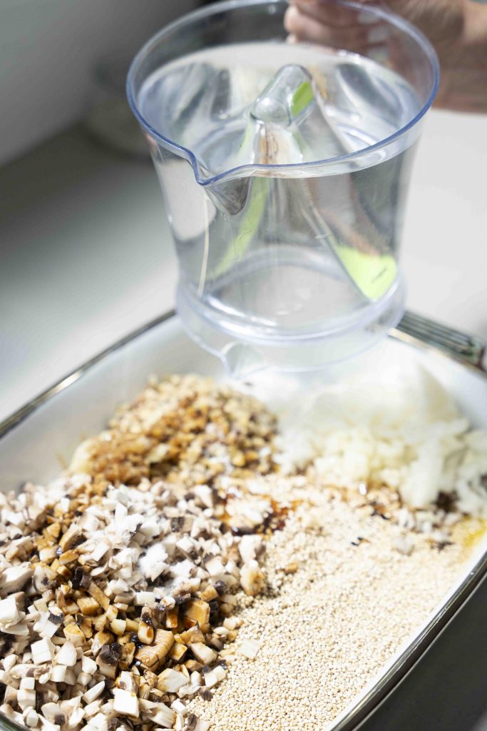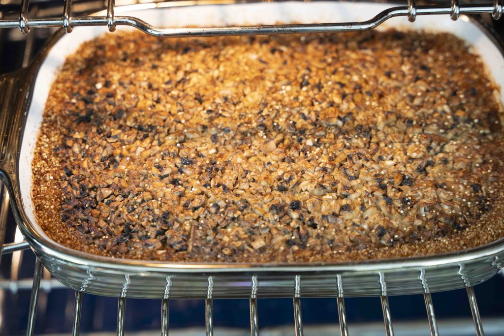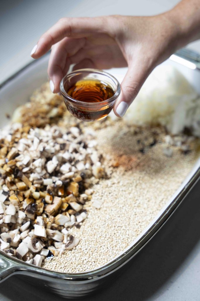 מכניסים את כל המצרכים לתבנית גדולה המתאימה לתנור: 2 כוסות הקינואה, סלסלת הפטריות הקצוצות, שקית הערמונים הקצוצים, הבצל הלבן הקצוץ, 3 שיני השום הכתושות, 1/4 כוס הסויה, 1/3 כוס שמן הזית, 2 כפות הסילאן/מייפל, 4 כוסות המים, כפית המלח והפלפל השחור הטחון טרי, מערבבים ומכניסים לתנור למשך חצי שעה.